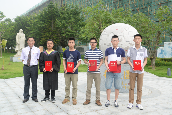 蔡远利校长、田晓皋副校长、洪尚任处长、何家汉处长、陈炜处长为2014届毕业生校友联络员颁发聘书
