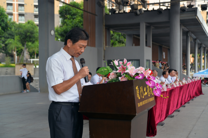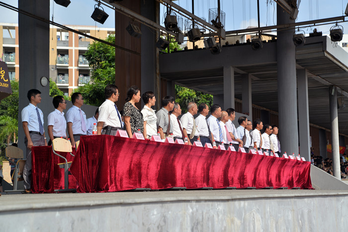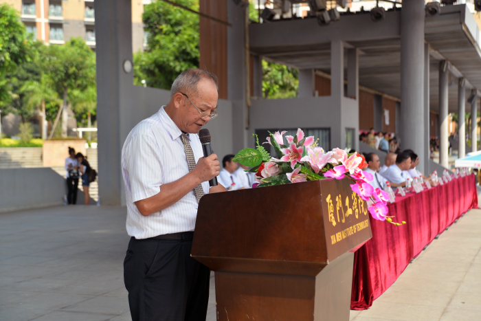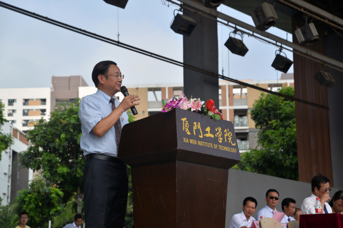 董事长李德文先生,华侨大学副校长、9499威尼斯手机版党委书记吴季怀教授,执行董事李雄虎先生,校长蔡远利教授,副校长兼党委常务副书记陈克明教授、副校长田晓皋教授以及各部门负责人、全体教职员工、在校学生代表以及2014级全体新生、部队官兵出席了此次典礼。典礼由校长助理