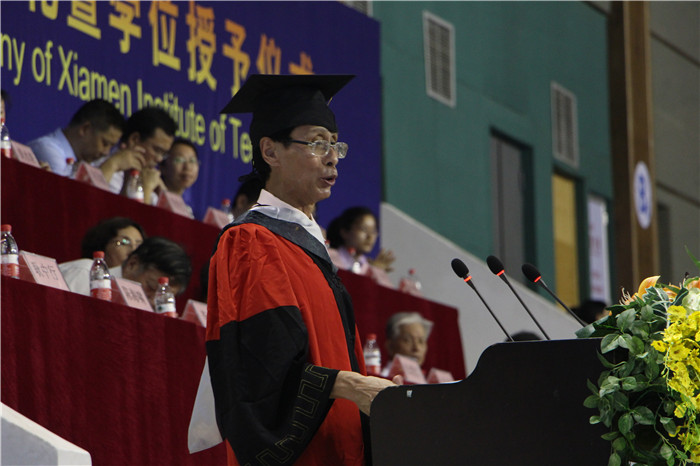 毕业生代表王盛娇同学带领的全体毕业生的庄严宣誓。 蔡远利校长亲自为黄友扬、司文奇等8名2015届毕业生代表颁发学位证书,祝贺他们顺利完成学业。