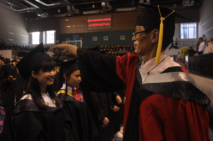 最后,校长蔡远利教授,副校长、学校党委常务副书记陈少牧教授,副校长田晓皋教授和各专业首席教授一起为我校2015届全体毕业生进行拨穗并合影留念。