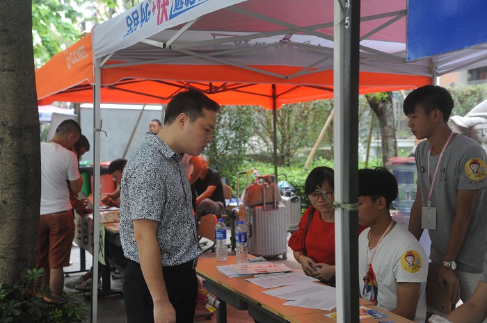 2日下午,各种迎新物资就已经在校内外各个迎新服务点准备就绪。3日早上六点,各学院已经在各自迎新点搭好帐篷、摆出桌椅,早早准备迎接新生,努力为新生和家长提供周到服务。