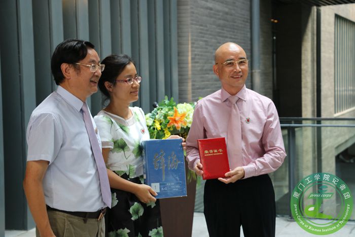 李德文董事长、蔡远利校长、周晓惠老师合影留念