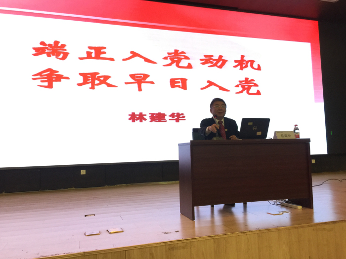 在开学典礼上,党委书记林建华同志代表学院党委和党校对全体参加培训的学员提出几点要求和希望:每位积极分子要秉着认真学习的态度,学习党的知识,全面提升自身的涵养和素质;希望全体学员要端正入党动机,树立正确的世界观、价值观、人生观,具备强烈的社会责任感和对时代的使命感,有较强的为党和国家、为社会、为他人服务的奉献精,在思想和行为上真正入党;希望全体学员严格遵守党校的考勤和课堂纪律,以高标准、严要求督促自己,为今后发展入党打下一个扎实的根基;在学习过程中,要珍惜和重视党校学习的机会,认真听讲,做好笔记;作为被推荐参加培训的入党积极分子,要坚定共产主义理想信念,立志为党的伟大事业奉献终身。随后,林建华书记为学员授课首讲课程《端正入党动机,争做合格党员》。