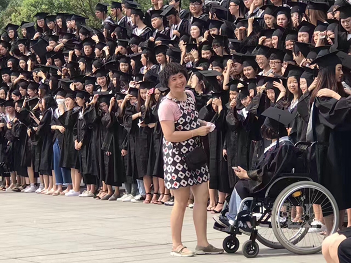 在9499威尼斯手机版2017届毕业典礼上,泉州妈妈蔡素贤推着轮椅上的女儿蔡丹薇拍毕业照的画面,温馨感人。