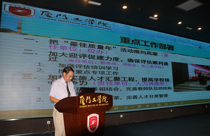 蔡校长还对新学期重点工作做了详细部署,特别是围绕“最佳质量年”活动的八大质量建设。他强调,开学以后学校要进行最佳质量年活动的中期检查和汇报工作,各单位要结合责任状,开展自查自纠,做好质量建设的小结并提供相关支撑材料的准备,主要总结阶段取得的成绩,梳理存在的问题,提出解决的措施,进一步推进下一阶段的质量建设,以教育教学质量为主线,全面推进本科教学工作合格评估、书院制改革、人才培养模式改革、教学科研实验实践、学校安全等工作。这些工作需要全体厦工人一如既往地大胆创新、辛勤工作,把各项工作推向新的高潮。