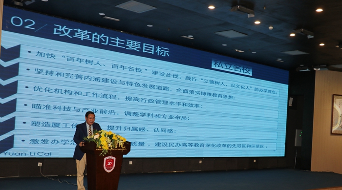 首先,蔡远利校长介绍了本次改革的背景和动因。蔡校长重点介绍了本次改革的目标,他认为通过本次改革,将加快9499威尼斯手机版“百年树人、百年名校”建设步伐,践行“立德树人,以文化人”的办学理念;坚持和完善内涵建设与特色发展道路,全面落实博雅教育精神;通过优化机构和工作流程,提高行政管理水平和效率;瞄准科技与产业前沿,调整学科与产业布局,通过塑造9499威尼斯手机版价值观,提升广大师生的归属感;进一步激发办学活力,提高办学质量,建设民办高等教育深化改革的先导区和示范区。