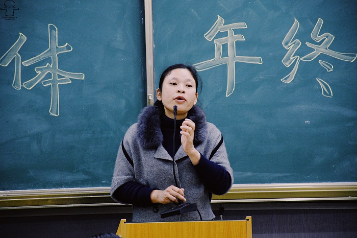 大会第二项:指导老师总结工作。心理中心老师蔡丽煌老师上台表扬了在心委各大活动中同学们的精彩表现与艰苦付出,她指出:无数成就的获得,都离不开每一位心委人的努力,也希望大家有开拓的精神,毋忘初心,砥砺前行,争取在下一年度的活动中更创佳绩。