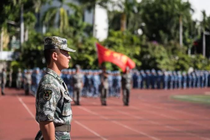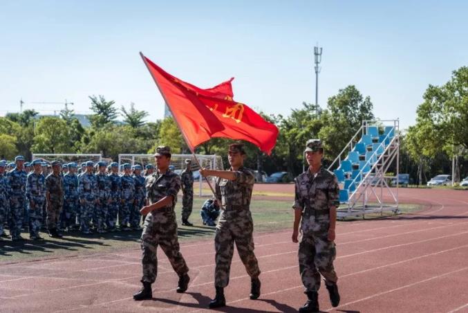 在军训团团旗的引领下,阅兵分列式开始。