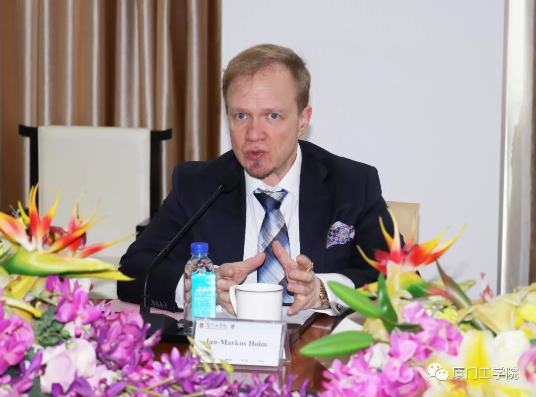 芬兰首都高校联盟副总裁Jan-Markus Holm介绍道,芬兰首都高校联盟由芬兰哈格-海利尔科技大学、拉瑞尔科技大学、赫尔辛基城市科技大学3所大学联合组建,涉及专业较广,相信能和我校建立很多的合作项目。