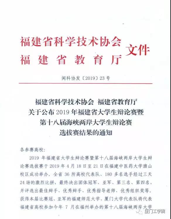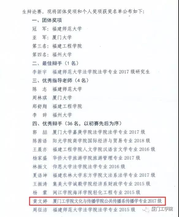 近日,福建省科学技术协会、福建省教育厅公布2019年福建省大学生辩论赛暨第十八届海峡两岸大学生辩论赛选拔赛结果的通知,我校获得优秀组织奖,文化与传播学院公共传播系传播学专业2017级黄文婷同学荣获优秀辩手称号!