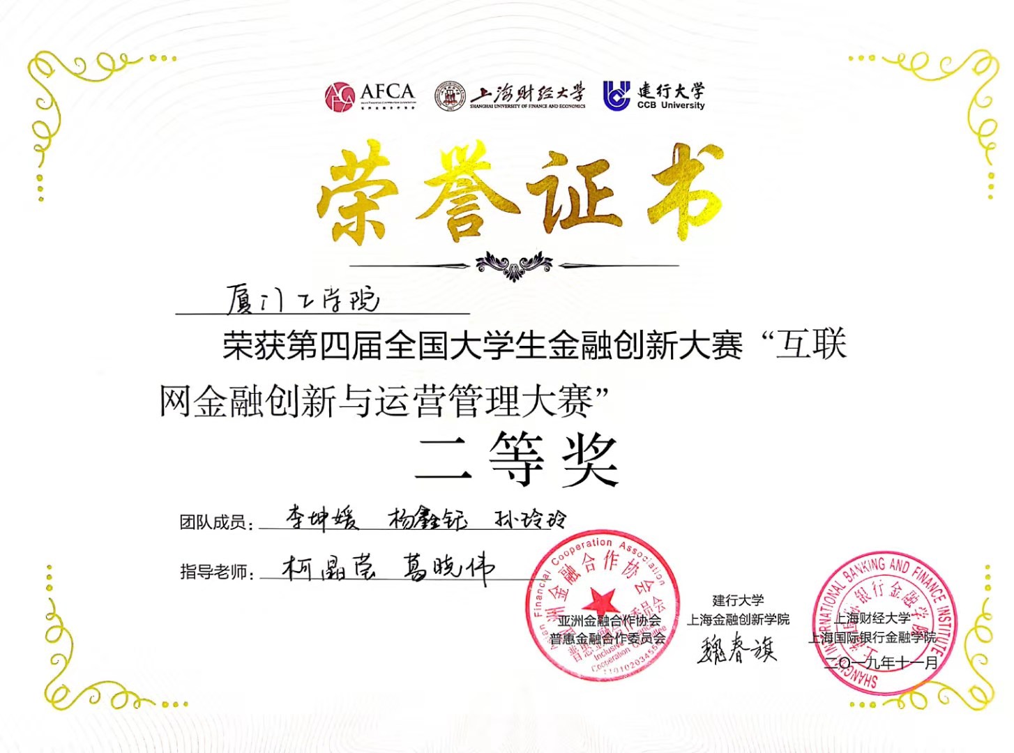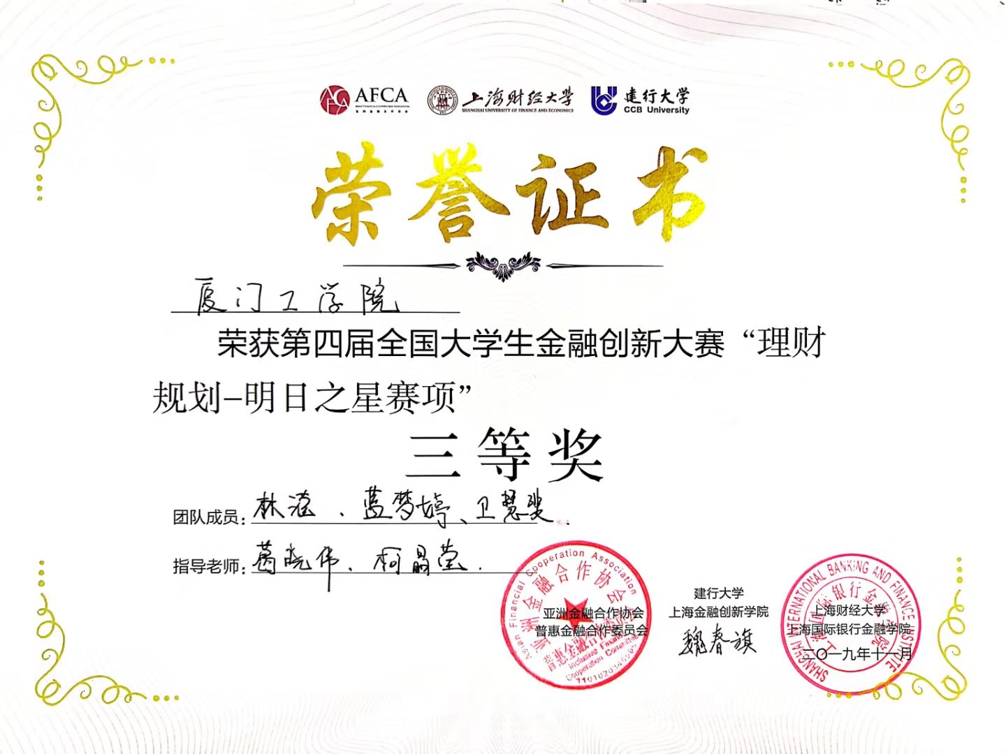 商学院投资学专业学生代表我校参赛并包揽所有奖项,郑滢敏、黄进松、李江川荣获“保险创客核心业务赛项”团体一等奖;杨嘉婷、周静怡、王佳颖荣获“智慧银行创新服务赛项”团体二等奖;李坤媛、杨鑫钰、孙玲玲荣获“互联网金融创新与运营管理大赛”团体二等奖;林滢、蓝梦婷、卫慧斐荣获“理财规划-明日之星赛项”团体三等奖,林滢、蓝梦婷分别获得“理财规划-明日之星赛项”个人优胜奖;李江川、郑滢敏、黄进松荣获“新金融产品创新创意设计大赛”励志奖。