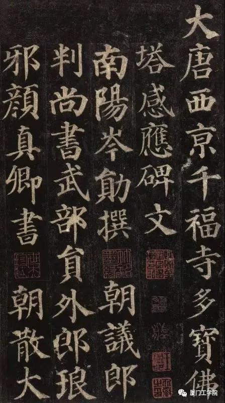 《多宝塔碑》,全称《大唐西京千福寺多宝塔感应碑》,天宝十一年(752)四月廿日建,颜真卿书丹,碑高260.3cm,宽104cm,碑文三十四行,满行六十六字,现藏西安碑林。碑文写的是西京龙兴寺和尚楚今静夜诵读《法华经》时,仿佛时时有多宝佛塔呈现眼前,他决心把幻觉中的多宝佛塔变为现实,天宝元年选中千福寺兴工,四年始成。在千福寺中每年为皇帝和苍生书写《法华经》、《菩萨戒经》,这在佛教史上,有特殊的意义。 、、此碑是颜真卿四十四岁所书,是早期成名之作,书写恭谨诚恳,直接二王、欧、虞、褚余风,而又有与唐人写经有明显的相似之处,说明颜真卿在向前辈书法家学习的同时,也非常注重从民间的书法艺术吸取营养。整篇结构严密,字行间有乌丝栏界格,点画圆整,端庄秀丽,一撇一捺显得静中有动,飘然欲仙。虽然此碑还称不上颜真卿成熟期之代表作,与他后来所书的《颜家庙碑》,《麻姑仙坛记》风格迥异,但它是颜书的第一篇,是颜楷成功的第一步,学颜体者多从此碑下手,入其堂奥。