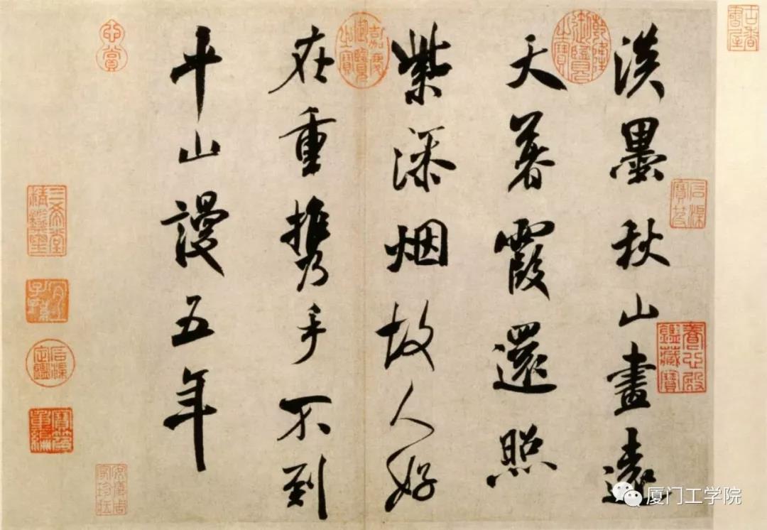 纸本行书, 29.1X31.9cm ,北京故宫博物院藏。 释文:淡墨秋山画远天,暮霞还照紫添烟。故人好在重携手,不到平山谩五年。 米芾《淡墨秋山诗帖》自作七绝一首,运笔如刷,笔力雄健,使转灵动,结字端妍,结态造势宽展肥美,精神饱满,无款印。当为米芾中年书法之精品。此帖流传有绪,历代著录于《墨缘汇观》、《石渠宝笈续编》,刻入《三希堂法帖》。现藏于北京故宫博物院。本幅钤有清代安岐及乾隆、嘉庆内府鉴藏印多方。收入清宫旧藏《米芾诗牍册》。 米芾(1051-1107),北宋书画家。宋徽宗召为书画学博士,曾官礼部员外郎,人称米南宫,因举止“癫狂”,人称米颠。能诗文,擅书画,精鉴别,行、草书得力于王献之,用笔俊迈豪放,与蔡襄、苏轼、黄庭坚合称“宋四家”。