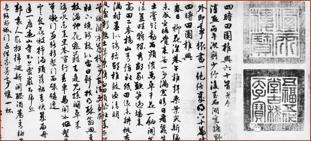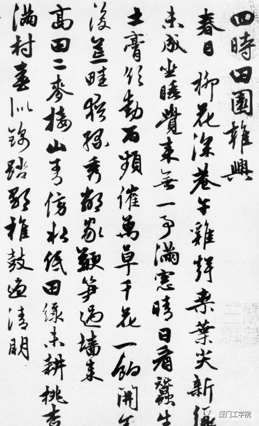 释文(局部):四时田园杂兴 春日 柳花深巷午鸡声,桑叶尖新绿未成。坐睡觉来无一事,满窗晴日看蚕生。土膏欲动雨频催,万草千花一饷开;舍后荒畦犹绿秀,邻家鞭笋过墙来。高田二麦接山青,傍水低田绿未耕。桃奇满村春似锦,踏歌椎鼓过清明。 朱德润,字泽民,元代书画家。年轻时以诗文书画闻名乡里,曾经赵孟?/推荐,官国史编修、镇东行中书省儒学提举。善诗文,工书法,笔迹遒丽。擅画山水,初学许道宁,后宗郭熙,多作溪山平远、林木清森之景。也善画人物。书法学王羲之,笔力遒健。著有《存复斋集》。
