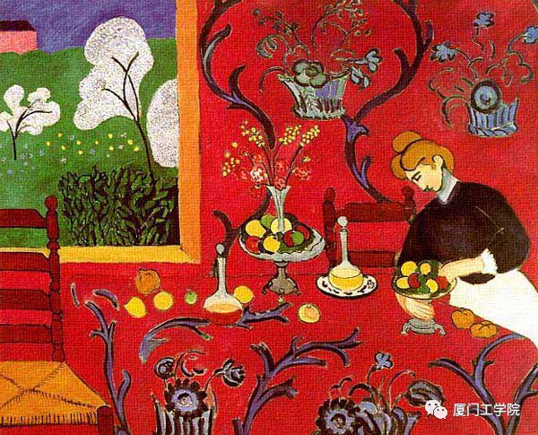 《红色中的和谐》是马蒂斯于1908-1909年创作的油画作品,是其成熟期的代表作。画中描绘了一个室内的场景,其中有精心布置的桌子、衣着整洁的女佣、鲜艳的桌布和墙纸、两把椅子和一扇窗户;通过窗户,画家还描绘了一片室外的自然景色:绿色的草地、黄色的花朵、几棵树和一所房子。然而马蒂斯并没有将这些物象,画得与它们在自然中实际的模样相符合。
