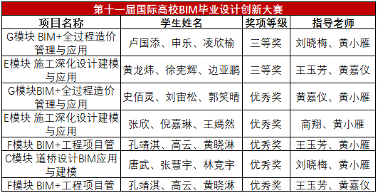 在第十一届国际高校BIM毕业设计创新大赛中,我校建筑科学与土木工程学院的师生团队获三等奖2项,优秀奖5项。王玉芳、黄嘉仪、商翔、刘晓梅、黄小雁等指导教师获优秀指导教师奖。具体名单如下: