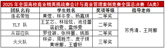 在2025 年全国高校商业精英挑战赛会计与商业管理案例竞赛全国总决赛(A类)中,我校商学院学生获二等奖3项、三等奖1项。具体名单如下:
