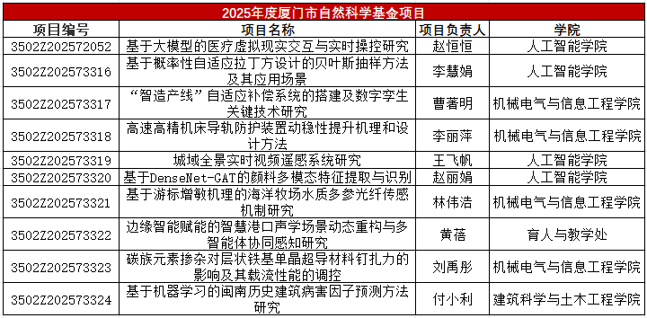 我校多位老师申报的项目获批2025年度厦门市自然科学基金项目立项。项目名单如下: