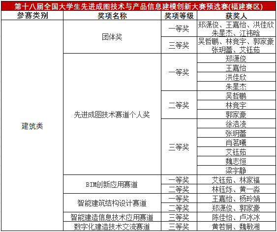 在第十八届全国大学生先进成图技术与产品信息建模创新大赛预选赛(福建赛区)中,我校建筑科学与土木工程学院代表队荣获大赛建筑类团体一等奖1项、三等奖1项;先进成图技术赛道一等奖4项、二等奖3项、三等奖6项;BIM创新应用赛道一等奖1项、二等奖1项;智能建筑结构设计赛道一等奖1项、二等奖1项;智能建造信息技术应用赛道三等奖1项;数字化建造技术交流赛道三等奖1项。具体名单如下: