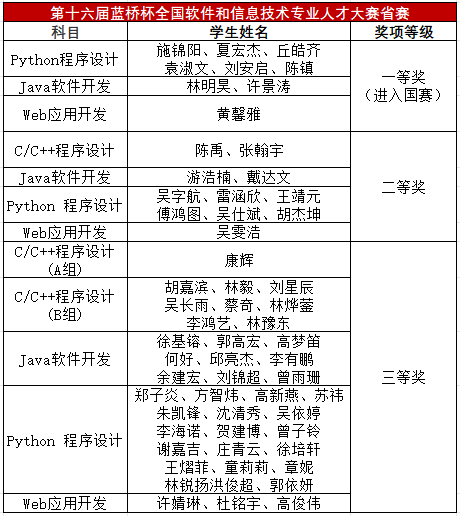 在第十六届蓝桥杯全国软件和信息技术专业人才大赛个人赛省赛中,我校人工智能学院学生获一等奖9项、二等奖11项、三等奖40项。具体名单如下: