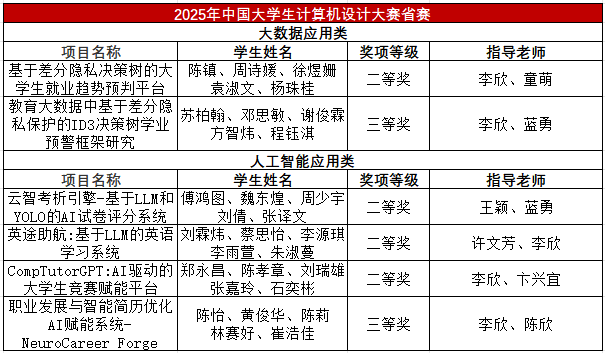 在2025年中国大学生计算机设计大赛(A类赛事)省赛中,我校人工智能学院学生获二等奖4项、三等奖2项。具体名单如下: