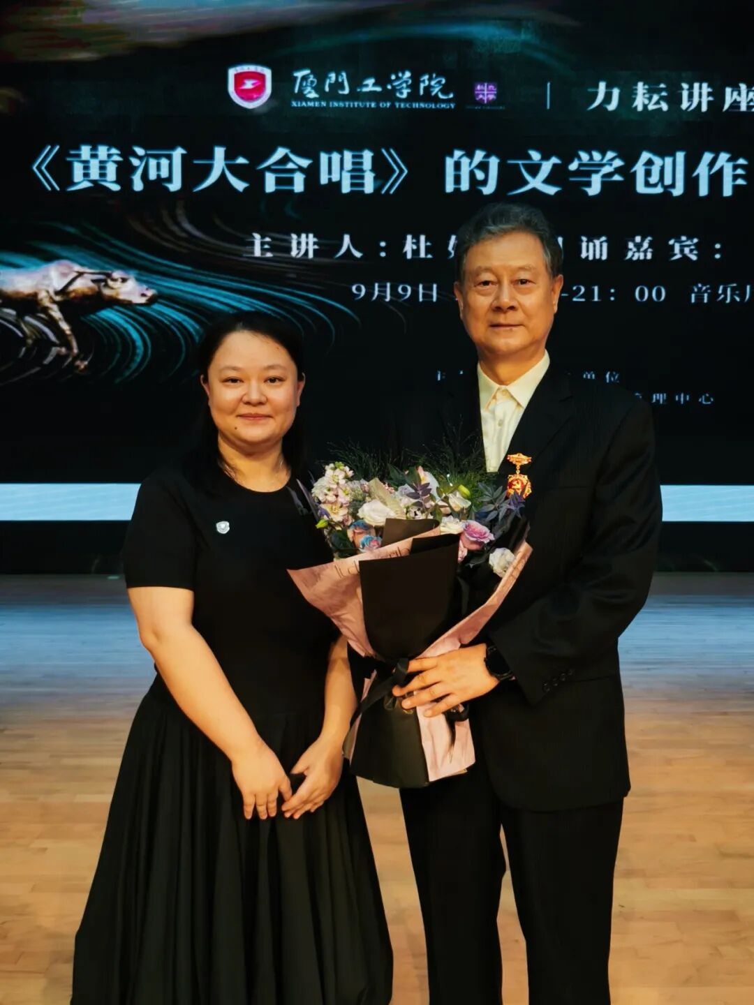 讲座当晚还出现了一个令人动容的画面。刘志强老师因出现小口误,向全场鞠躬道歉。“刚才朗诵的时候,我有个地方词说错了,我记了很多遍,背了很多遍。但是我七十多岁了,忘性比较大。我感到非常抱歉,请同学们原谅!”刘志强老师用行动诠释了严谨敬业的精神,展现了对讲台和《黄河大合唱》这部作品的尊重,赢得了全场掌声。“真诚火热的心永远都会燃烧下去!”博雅教育与艺术传媒学院林翰灵老师用镜头记录下了这一动人瞬间。