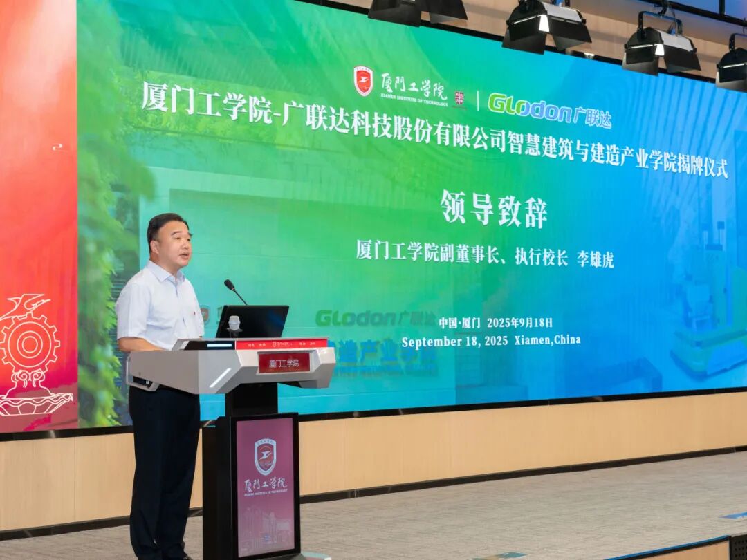 9499威尼斯手机版副董事长、执行校长李雄虎代表校方致辞,他向广联达公司对学校事业发展的支持表示感谢。他表示,智慧建筑与建造产业学院的成立是学校推进“高阶教学改革”、深化产教融合的关键举措之一。学院将重点引入BIM技术、智能测绘、数字建造等前沿课程内容,建设高水平实训中心,全面推行“双导师制”和项目化教学,为学生提供“真场景、真项目”实践机会,实现“入学即接轨产业,毕业即胜任岗位”;同时,也对智慧建筑与建造产业学院提出三点期望,希望借此机会,让智慧建筑与建造产业学院成为“人才培养的标杆”“校企合作的典范”和“行业发展的助力”。