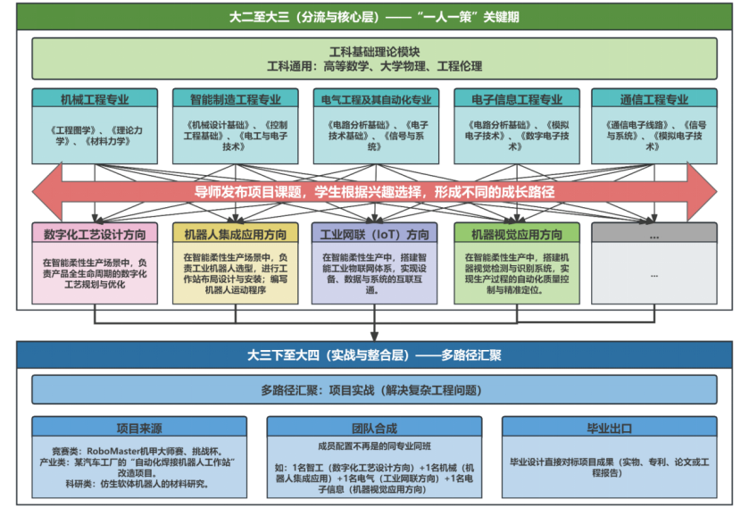 面向智能制造领域“系统复杂、技术交叉、迭代快速、岗位能力复合化”的典型特征,人才培养必须从“课程知识传授”转向“工程能力生成”,并以成果导向(OBE)贯穿全过程。“从大二至大四的成长路径图”,以“分类分层、项目导向、能力导出”为核心理念,构建了以学生兴趣为驱动的个性化、多路径工程教育新体系。采用“先分流、后汇聚”的培养模式,将基础理论系统转化为解决复杂工程问题的实战能力。