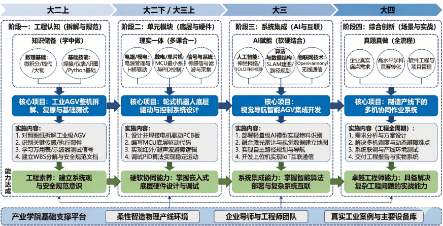 其三,以代表性项目贯通培养链条,形成螺旋上升的能力路径。以“AGV小车设计与应用”为例,AGV系统包含机械底盘与驱动机构、电源管理、感知与导航、运动控制、通信与调度等典型要素,天然具备跨学科与系统集成属性,适合作为贯穿式项目载体: