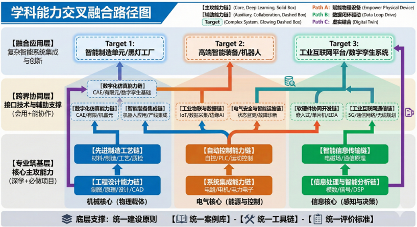 智能制造的工程能力最终表现为系统集成与复杂问题求解,但其根基来自扎实的数理基础与机械/电气/信息等学科基础。宽口径基础相当于智能制造能力的“躯体”,决定了学生能否理解装备、控制与信息系统的共同语言。培养过程中强调基础课程与工程任务之间的可追溯关系,避免知识碎片化与“学用断层”。