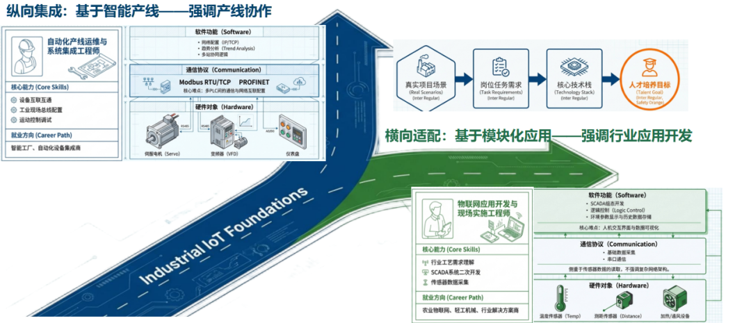 同一门课程“工业物联网技术及应用”,基于不同的岗位任务需求,将产生截然不同的课程设计路线,自动化产线运维集成工程师,在基于智能产线项目时,强调产线协作,需要完成纵向集成;物联网应用开发与实施工程师,则是在智慧农业、智慧家居等模块化场景中,需要结合不同行业应用进行横向适配。