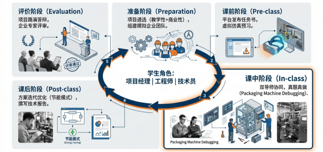 有了目标和场景,还需要科学的组织实施方式来驱动教学过程。教学实施可划分为五个闭环环节,这个适用于大部分的项目式课程。