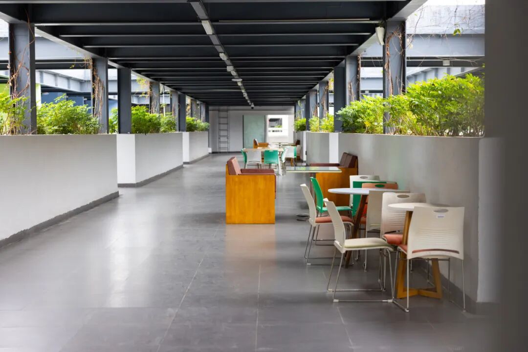 在阅读区的桌椅上洒下斑驳光影